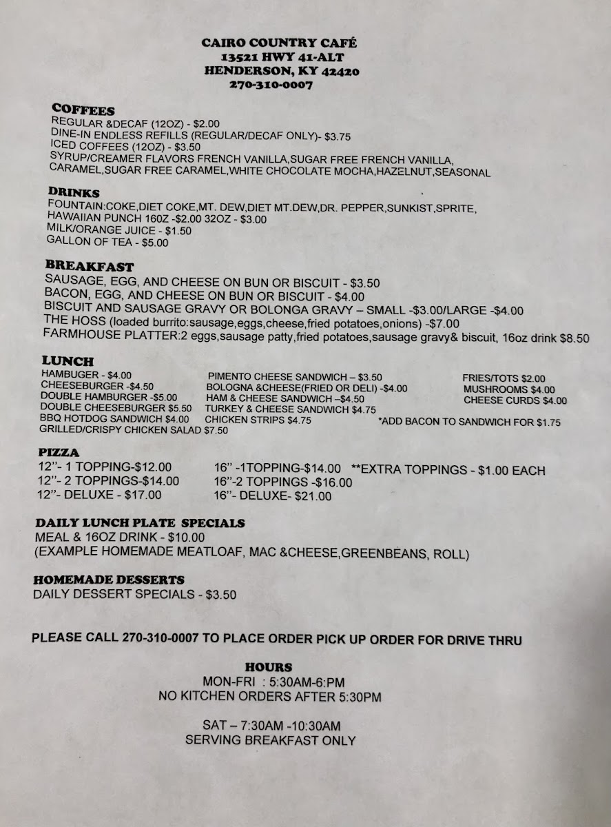 Welcome to Cairo Country Cafe, a delightful eatery nestled in Henderson, KY, where comfort food meets warmth and hospitality. The menu boasts an enticing array of breakfast options, featuring favorites like Sausage, Egg, and Cheese sandwiches and the hearty Farmhouse Platter. Daily specials, such as their tempting Potato Soup on Fridays, add a unique twist to the cafe experience.